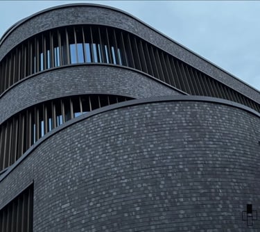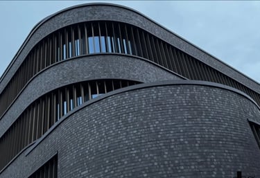 Architektur: Abgerundete Klinkerfassade, gerundete Fenster
